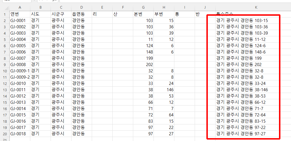 위 이미지에 보면 엑셀 H2에는 '부번'이라는 보조 지번 셀이다.