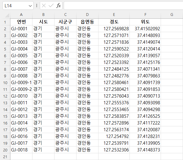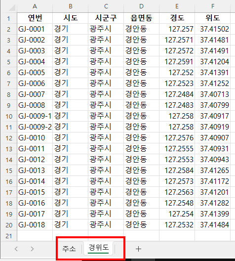 두번째 '경위도' 시트의 연번을 1로 기준삼고 하나씩 세어보면 경도는 5번, 위도는 6번째에 위치하고 있다.